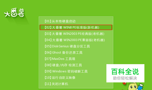 u盘插入电脑usb接口中,重启电脑后进入大番薯主菜单界面,按方向键“↓,↑”选择“【02】大番薯WIN8 PE标准版(新机器)”,回车键进入,如图所示: