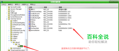 进入以下路径:[HKEY_LOCAL_MACHINE\SYSTEM\CurrentControlSet\Control\Terminal Server\Wds\rdpwd\Tds\tcp],其下的"PortNumber"键值所对应的就是端口号,将PortNamber值(默认值是3389)修改成所希望的端口即可(随意是什么都可以),例如5854。