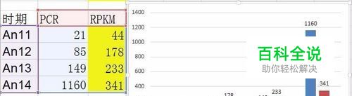 将柱状图中PCR的数据改为PCR_1的数据,操作如下: 选择PCR数据柱,右键>选择数据>编辑>选取数据>系列值选为PCR_1的数据>确定>确定,得新的柱状图。