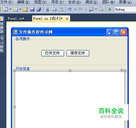 在新程序界面空白窗口上放置合适的控件:包括, 显示操作流程的textbox控件; 添加2个按钮控件【打开文件】、【保存文件】。