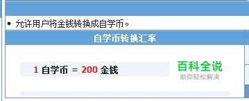 看到上图中的“ 换取自学币”,将光标移到此外,并单击,然后出现如下图……注意图中的“ 自学币转换汇率”…… 1自学币=200金钱这时你就想知道怎么获取金钱了吧……