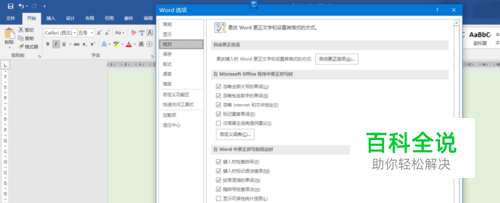 点击菜单栏中的“文件”——“选项”,弹出“word选项”对话框,再点击“校对”——“自动更正选项”
