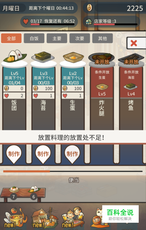 至于放置料理,尽可能选择 白饭、主要、次要、其他四种,可以增加收入