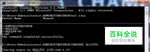 在列出的电脑名称列表中选一台电脑,输入TRACERT dell755,回车后会显示这台电脑的IP地址