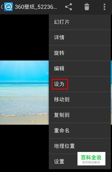 另外,还可以打开相册工具,在图片浏览界面设置壁纸,点击“设为”,然后选择“壁纸”即可。