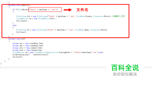 编写保存数据的文本文档创建代码: private void newFile() { if (!File.Exists("Vista" + dateTime + ".txt")) { FileStream fs1 = new FileStream("Vista" + dateTime + ".txt", FileMode.Create, FileAccess.Write);//创建写入文件 StreamWriter sw = new StreamWriter(fs1); fs1.Close(); } else { FileStream fs = new FileStream("Vista" + dateTime + ".txt", FileMode.Open, FileAccess.Write); fs.Close(); } }