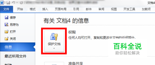 打开Word文档,点击左上角的文件按钮,在信息栏目下选择保护文档按钮