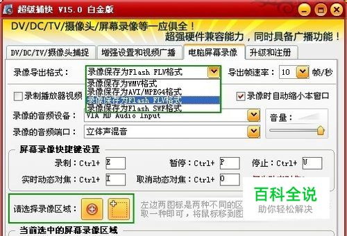 录制导出的格式和选择录像区域 除了录制网页上的视频和音乐,软件还可以录制游戏视频、电脑屏幕操作画面、播放器视频等。在“录像导出格式”的下拉框中,我们可以导出FLV,AVI,WMV等常用的视频格式。为了准确的录制视频的播放画面,我们可以使用下图中的两个工具,快速定位你的录像区域的。