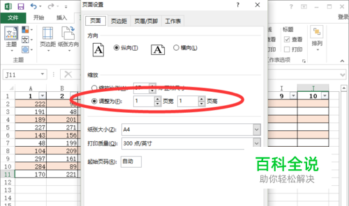 五、在页面设置的“页面”中的“缩放”栏下,选中“调整为”,并将“页宽”和“页高”两个输入框中的数字都设置为“1”。如图所示;