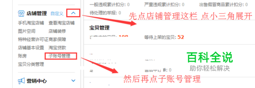 左侧栏店铺管理 点小三角展开 找到子账号管理,点击进入。