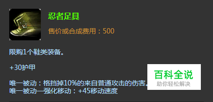 鞋子方面选择忍者鞋,如果你是一个合格的剑圣使用者,那么你一定会使用Q技能躲避敌方的控制技能了。