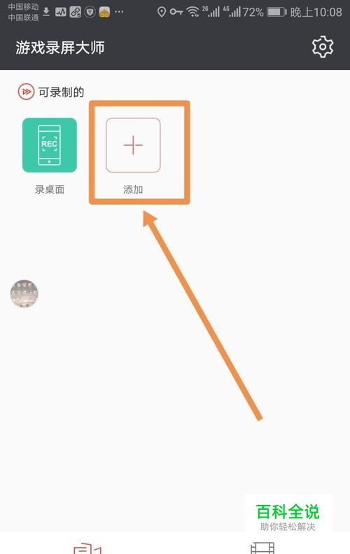 为了录制游戏,需要在进入应用界面后点按箭头指向的添加标志。