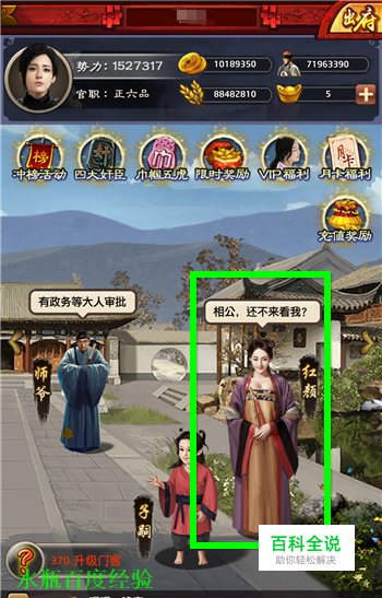 先来介绍下游戏中的“红颜系统”。 红颜系统位于“府邸”内。玩家获得红颜后进行宠幸。有几率获得子嗣。红颜的亲密值越高,生出的小孩天资越高,将来获得的势力加成越大。因此培养红颜要有侧重点。一般都是给主力门客对应的红颜加亲密值。