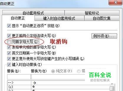 ③在弹出的“自动更正”窗口中同2003中相同,取消“句首字母大写”前面钩钩即可。