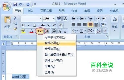 方法一、直接单击“开始”功能区的“字体”分组中的“更改大小写”按钮,里面包含了我们常用的“句首字母大写”、全部小写、全部大写、每个单词首字母大写等等,根据跟人需求选择即可。(如下图)