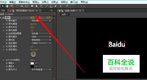 在“合成栏”右键单击,依次选择:效果—风格化—辉光,选定后文字便产生了发光特效。左侧弹出了“特效控制台”,在这里可以调整文字发光的阈值,颜色,模式等等...