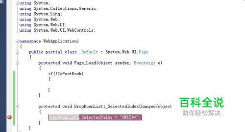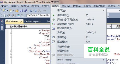 在visual studio “调试”>>“启用调试”,就可以开始调试程序,或者使用快捷键F5。调试会从程序的头部开始执行,如:main函数,网页中的Page_Load。