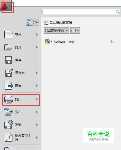 第一步:打开cad软件左上角的图标,在出现的下拉菜单点击“打印”按钮。