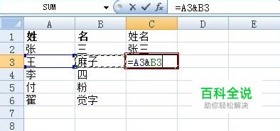 在excel中&可以将两个单元格的内容拼接在一起,有点和程序中的意思相似,连接起来。如表格中的例子,将姓和名连接起来,只需在C列输入:=A2&B2,即可,下面的直接下拉就行。