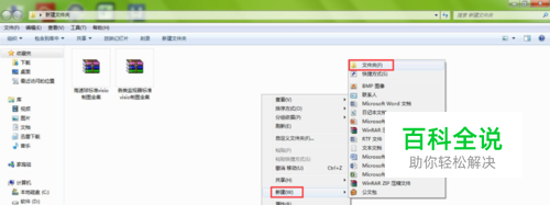 首先在压缩包文件所在的文件夹内新建一个文件夹,在空白处点击鼠标右键,弹出下拉菜单,选择【新建】-【文件夹】选项。如下图所示。