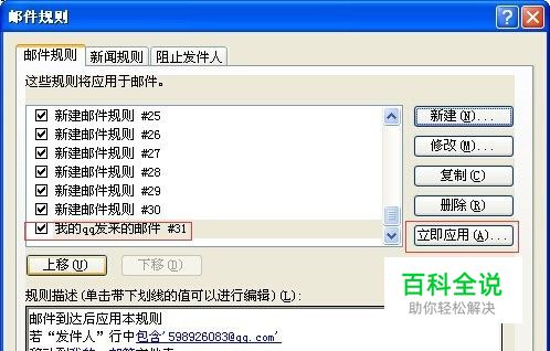 点击”立即应用“可以对之前的邮件进行分组 选择要应用的规则,选好应用在哪个文件夹里,之前没分组过要选“收件箱”,单击”立即应用“,然后确定