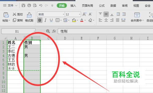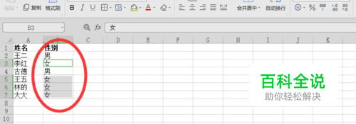 此时,空白格会特别凸显出来,选择此列,在空白单元格输入框内打入女或其他需要文字,如下图