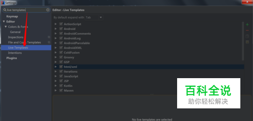 在设置界面的搜索框中输入live template查找到Live Templates配置项