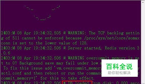 看看启动情况 Output: 2403:M 08 Apr 19:34:32.505 # WARNING: The TCP backlog setting of 511 cannot be enforced because /proc/sys/net/core/somaxconn is set to the lower value of 128. 2403:M 08 Apr 19:34:32.506 # Server started, Redis version 3.0.6 2403:M 08 Apr 19:34:32.506 # WARNING overcommit_memory is set to 0! Background save may fail under low memory condition. To fix this issue add 'vm.overcommit_memory = 1' to /etc/sysctl.conf and then reboot or run the command 'sysctl vm.overcommit_memory=1' for this to take effect. 2403:M 08 Apr 19:34:32.506 * DB loaded from disk: 0.000 seconds 2403:M 08 Apr 19:34:32.506 * The server is now ready to accept connections on port 6379