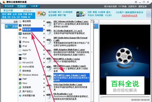 点击一下下方预制方案旁边的下拉框,进入输出格式选择面板,看到这里你就知道前面为什么说这款转换工具强大了,有了它,您可以几乎在所有流行的视频格式之间,任意相互转换。如:rmvb、3gp、mp4、avi、flv、f4v、mpg、vob、dat、wmv、asf、mkv、dv、mov、ts、webm、等视频文件,编辑转换为手机、iPod、iPhone、PSP、iPad、MP4机等移动设备支持的音视频格式。因为是要将mkv转mp3格式的,所以选择输出格式为mp3格式。