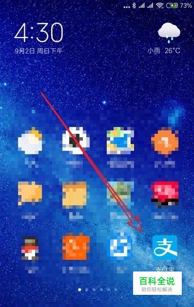 首先我们在手机上左右滑动屏幕,在屏幕上找到安装好的“支付宝”的图标,点击后打开并登录支付宝