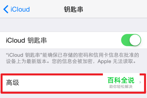 首先打开iPhone的【设置】-【iCloud】-【钥匙串】,钥匙串应该处于开启的状态,点击【高级】
