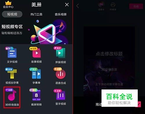 美册短视频专区,点击“3D环绕音效”按钮可以制作热门音效视频。 功能按钮内,导入下载好的音频或视频,软件内也有提供音频素材,导入视频软件会帮你提取出音频,点击对勾进入制作页面。