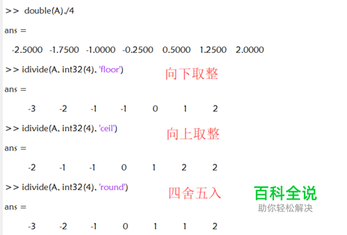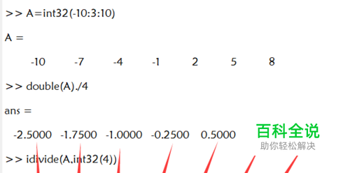 首先,我们用A=int32(-10:3:10)产生32位整数列表。然后用double(A)./4可以看到双精度的除法结果。 再用过idivide(A, int32(4)),计算整数除法,将A中每个元素除以4. 可以看到,idivide的默认操作为舍去小数。