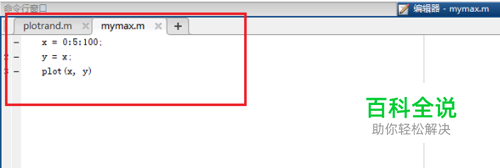 第一步我们打开软件,创建一个脚本文件,使用函数y=x,通过plot命令来绘制一条直线,输入如下代码,点击运行