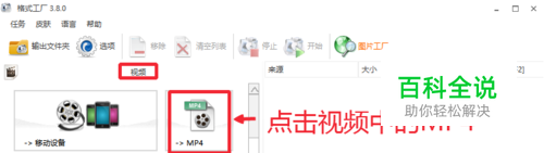 这里用格式工厂进行转换,首先下载安装格式工厂到自己电脑,然后打开运行格式工厂软件,窗口界面中,我们点击 视频中的MP4选项打开,如图所示操作。