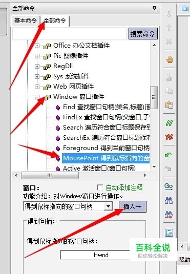 选择全部命令-插件命令-Window 窗口插件-MousePoint,然后点击插入 此命令是用来获得鼠标所指向位置的窗口句柄