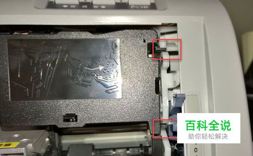 将色带架挂上。机身上两边都有两个卡扣与色带架对应,把色带架对准按下就进去了。