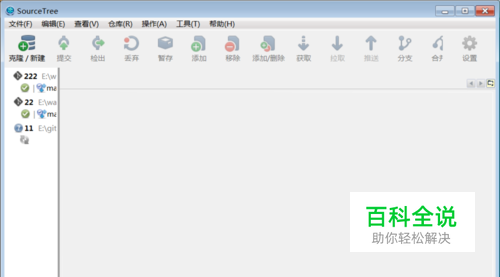 首先点击桌面的SourceTree图标来快速启动SourceTree。启动成功之后先来看看主页面 顶部为菜单栏。下面右边为本地为库列表