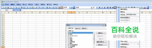 出现一个“自定义”对话框(不用管它,不需要用到这个对话框,但是不可以关闭),这时右键点击“合并单元格”的图标(会和平时右击不一样),并选择“总是只用文字”选项