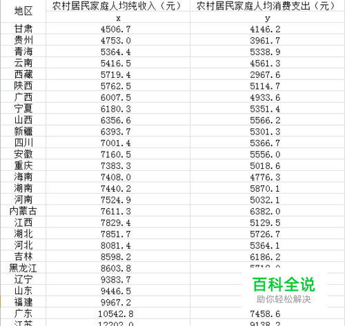 打开Excel.2010,首先输入课本例题7.1的全部数据,2012年各地区农村居民家庭人均纯收入与人均消费支出,如图