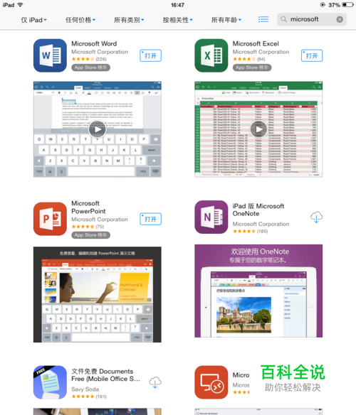 打开苹果官方应用商店“App Store”,在搜索栏中输入“Microsoft”会弹出下面搜索结果,分别下载和安装“Microsoft Word”、“Microsoft Excel”、“Microsoft PowerPoint”;