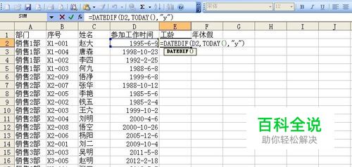 利用函数DATEDIF计算工龄,选中E2单元格,输入公式=DATEDIF(D2,TODAY(),"y"),将公式填充到本例的最后一个有效单元格,即可计算出员工的工龄。 解释:TATEDIF函数用计算2个时间点之间的时间数(参数3,Y表示整年数,M表示整月数,D表示天数,“YM”表示参数1和2之间的月数之差(忽略年和日),MD表示返回天数之差(忽略月和年),YD表示返回天数之差(忽略年),在计算两个时间点的整年数时,参数3为"y"。