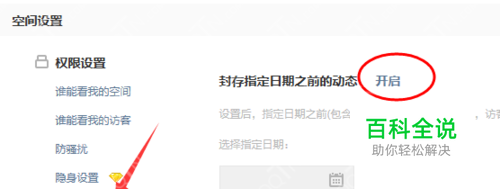 3、开启封存我的动态以后,是需要设置指定日期的,但指定日期必须是在1个月以前,如果大家想要删除所有的说说,那就需要将指定日期选择在11月份即可,本月的说说是不能够隐藏的哦!然后再封存内容那一栏上面勾选说说即可。