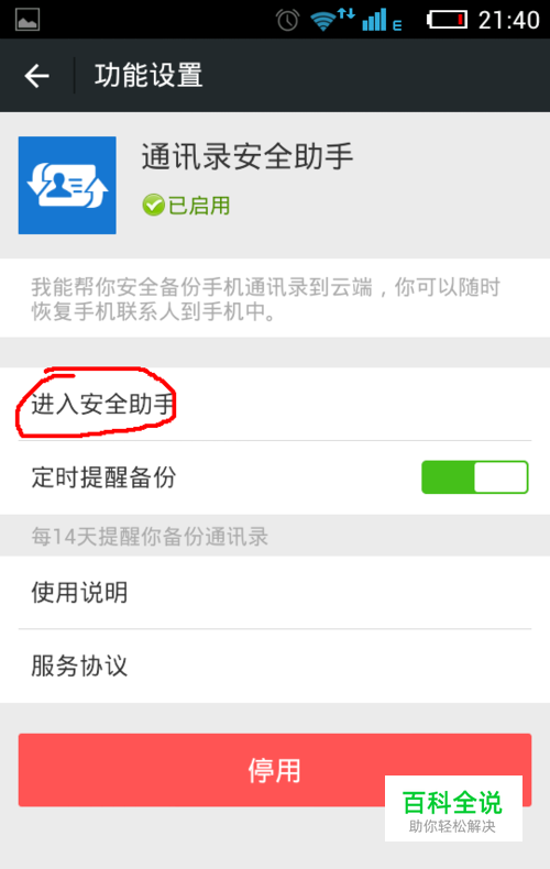 6、接着在通讯录安全助手中点击”启用该功能“,启用通讯录安全助手功能。