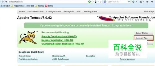 如何通过网页去部署已写好的代码至Tomcat服务器上呢?这里就需要在Tomcat服务器启动成功以后,打开首界面,通过Manager App进入。