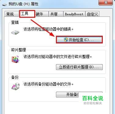 在弹出的U盘属性窗口中,选择“工具”标签,再点击“开始检查”按钮。