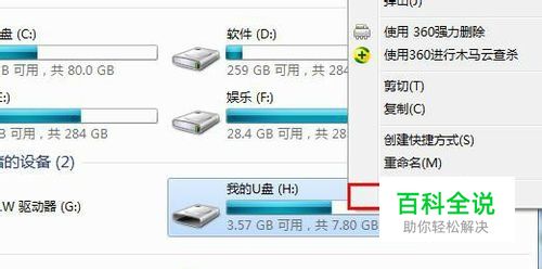 将鼠标移至U盘图标上,然后右键单击,在弹出的选项列表中点击“属性”选项。