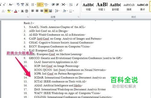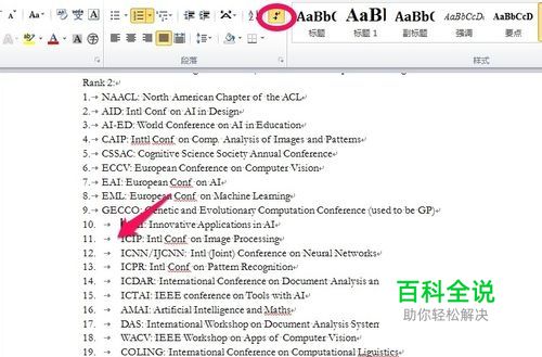我们这里有一篇会议名称列表,大家可以看到截图中红色箭头所示的地方间隔很大,现在我们点击图中上方红色圆圈所示的显示制表位按键,使word显示制表位。由于Word默认的双位数字以上编号后的制表符为4字节,所以导致编号10以后的编号后面的间距很大,非常影响排版效果。