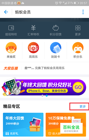 第二步进去会员界面之后,下滑可以看到各种积分兑换的,点击精品专区中的更多,如下图所示: