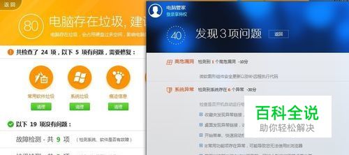 如图,左边为360卫士,右边为腾讯电脑管家。下面的分析图片同此顺序。首先从安全检测方面分析:速度来说,前者的检测速度比较快,而且给小编的电脑打了80分,后者监测较慢,原因是监测出来大量问题,给了个40分。这一点来说我认为腾讯电脑感觉更好,因为小编的电脑确实存在很大问题。